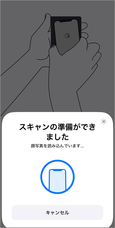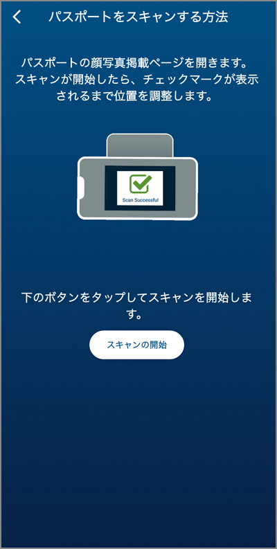 パスポートの顔写真掲載ページを開き、スキャンするとパスポート情報を読み込みます。