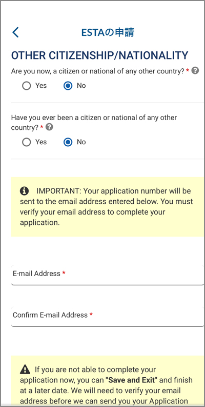 「現在日本以外の国籍を保有していますか?」、「今まで日本以外の国籍を保有していたことがありますか?」にそれぞれ答え、メールアドレスを登録。入力したメールアドレスに4桁の確認コードが届くので、コードを入力してください。