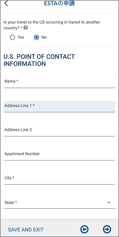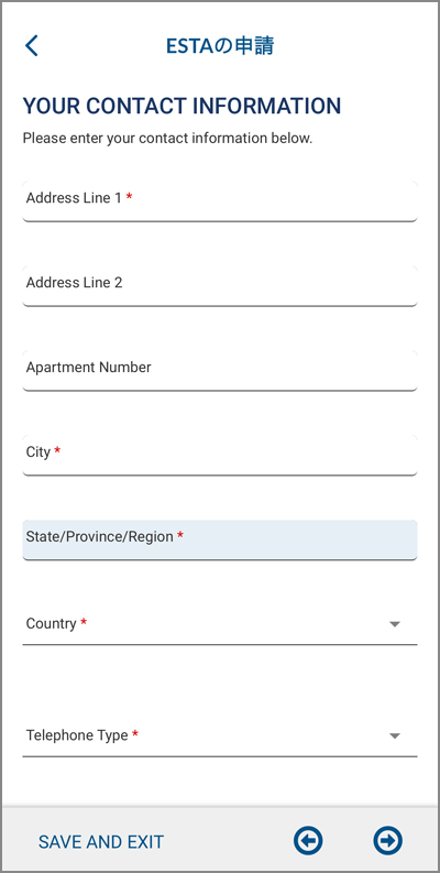 「アメリカでの滞在先住所は緊急連絡先と同じですか?」でYESを選んだ場合は入力不要です。