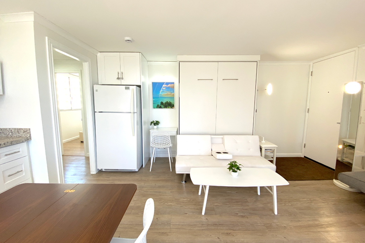収納式のクイーンベッドには、リネンが敷かれているので、引き出せばすぐ寝られてとても便利! しかもリビングにあるコーヒーテーブルは、もうひとつのソファベッドの下に畳んで収納可能。ベッドを引き出しても、スペースを最大限に使えるよう家具選びもこだわったお部屋なんです。