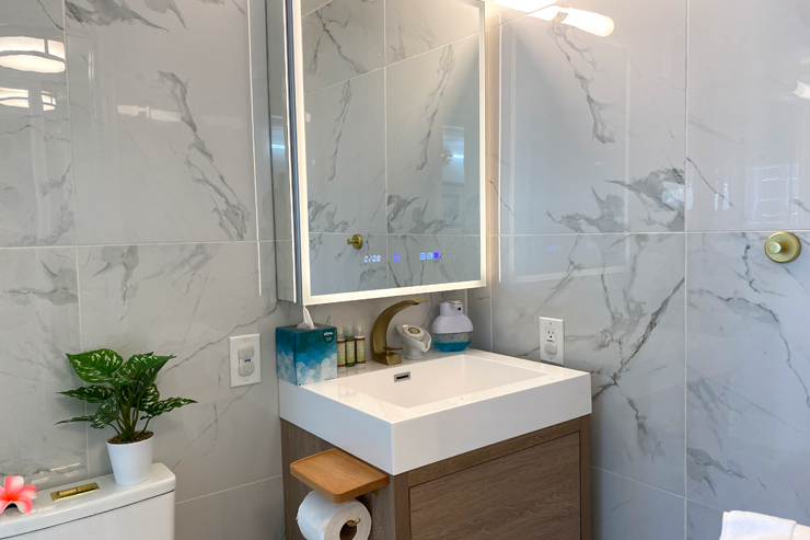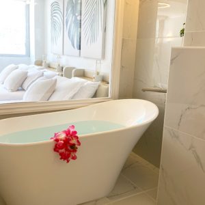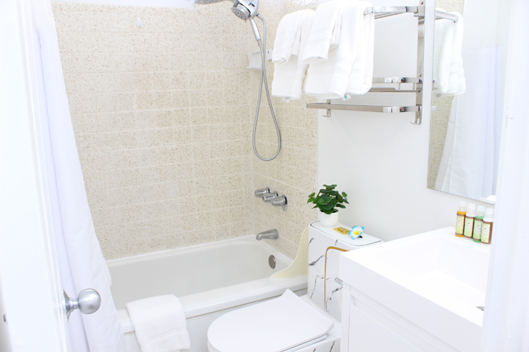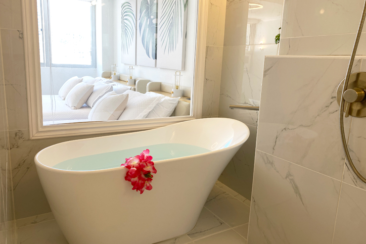 こちらのお部屋は、2グループでの利用の場合、ベッドルームもバスルームも専用で使えるのが魅力的。部屋のドアを閉めればプライベートな空間も確保できるので、親子2世代、3世代などの旅行にもぴったりだと思いました。しかもキッチン付きなので外食費を抑えられる分、お買い物やアクティビティに余ったお金を使えるので経済的。