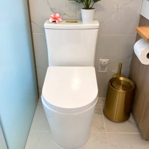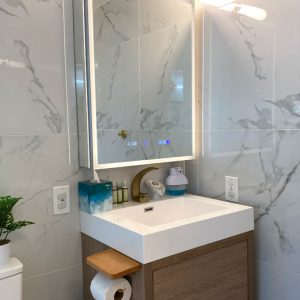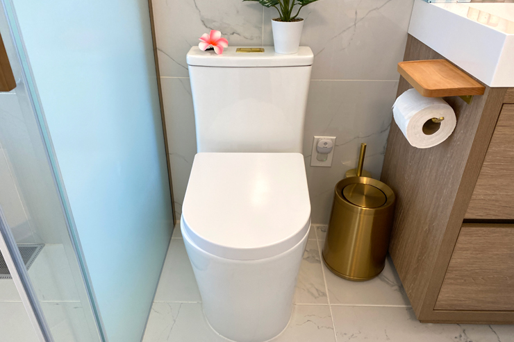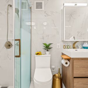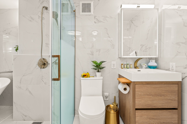 キッチンの裏側には1つめのバスルーム。設備はバスタブとレインシャワー&ハンドシャワーのコンボタイプ。可動式のシャワーがあると小さいお子さんとの入浴に役立ちます。