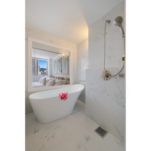 フルサイズの深いバスタブとシャワースペースがあるスパスタイルのバスルームで、ブラインドを開けると窓からシティービューが楽しめるという仕掛け。高級ホテルに滞在しているような気分になれますよね〜。