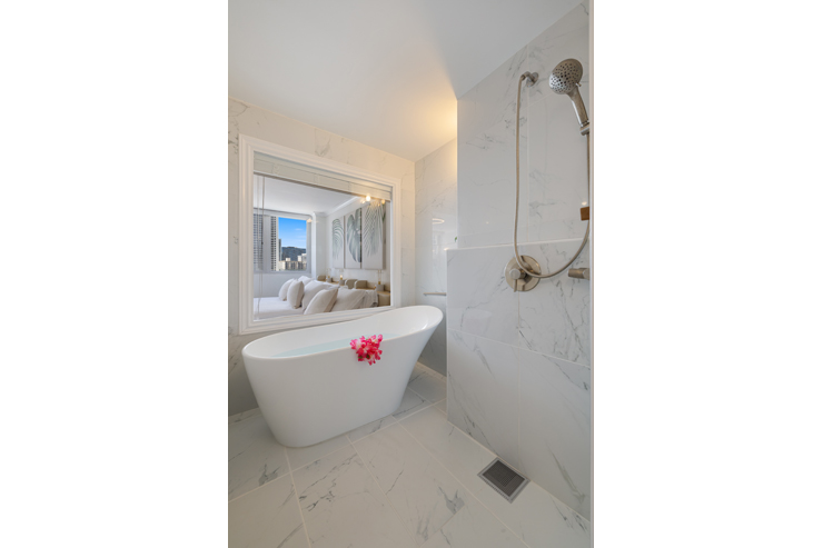 大きな窓からはワイキキの街並みと海が見え、ラナイの端のほうからはダイヤモンドヘッドも眺められ、ハワイらしい光景が最高! 朝はラナイでコーヒーを飲みながら海を眺め、日中はワイキキのビーチやショップ、カフェ巡りを楽しみ、夜は部屋でくつろぐ——そんなハワイらしい滞在が想像できます。