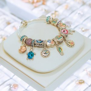 「神戸ジュエリー」では、PANDORA(パンドラ)のチャーム&ブレスレットを販売。そのほかのパンドラの店舗では取り扱いのないダイヤモンドヘッドやハイビスカス、パイナップルなど全6種の限定チャームが手に入ります。ウミガメといったハワイコンセプトのチャームも勢ぞろい。ジョーさんは日本語堪能&モチーフが持つ意味も熟知しているので、相談しながらチャームを組み合わせて自分だけのブレスレットが作れます。