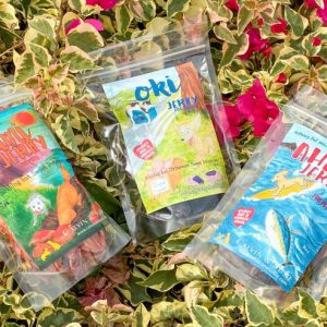 おやつ(写真右アヒ$15.50、写真左ヤミジャーキー$15、写真中央オキジャーキー$15)