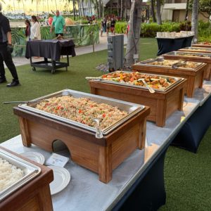 温菜には、フリフリチキン、BBQビーフブリスケット、カルアピッグ、アイランドキャッチ、ハワイアンフライドライスなどがずらり。