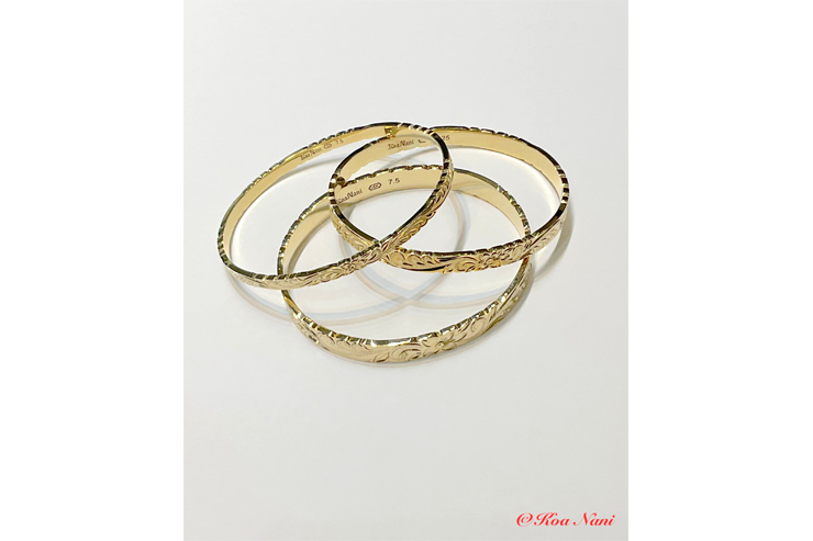 ◆ ブレスレット波とプルメリアをあしらった、華やかさと上品さが絶妙に融合したハワイ感たっぷりのデザインが魅力。14kイエローゴールドバングルは、4mm、6mm、8mm幅があり、お好みのサイズが選べます。単品でシンプルに着けたり、重ね着けしたりと、いろいろ楽しみ方ができるのがバングルのポイント。シンプルでありながら華やかなデザインは、デイリーからフォーマルまで、さまざまなシーンで活躍してくれます。