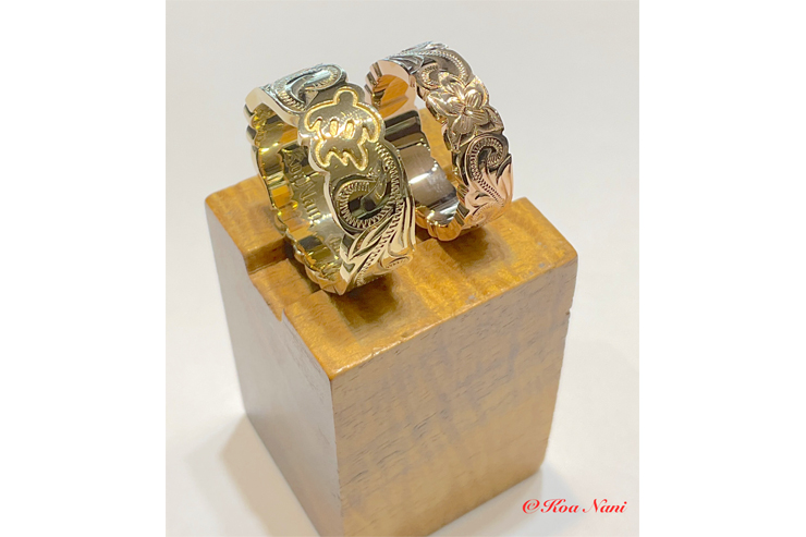 6mm幅14kピンクゴールドと8mm幅14kイエローゴールドのオリジナルリングには、ハワイの自然を象徴する「波」、「プルメリア」、「ホヌ」を彫刻。コアナニならではの高級感の漂うデザインで、身につけるだけで華やかさを演出します。