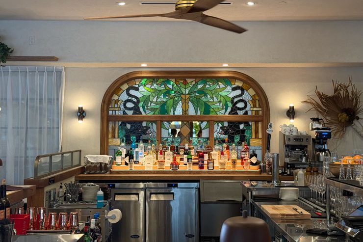 その奥には、印象的なステンドグラスアートが飾られ、ボタニコの世界観を象徴しています。