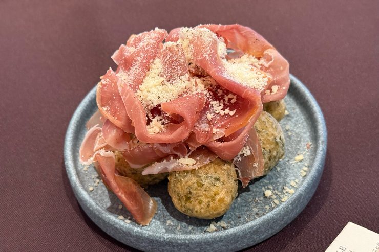 海苔の香りが広がるモチモチのゼッポリーニに、生ハムの塩気がベストマッチ。