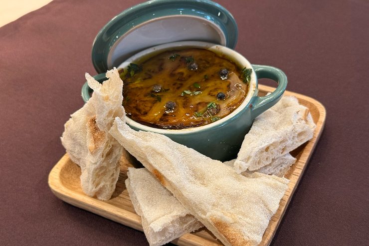 熱々で提供される、茄子とポテトのギリシャ風グラタン。優しい味わいでピンサにもよく合います。