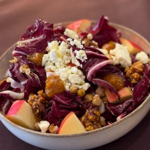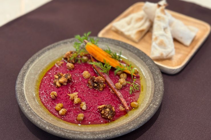鮮やかな色が目を引く、自家製フムス。ナッツの食感が良いアクセントになっています。