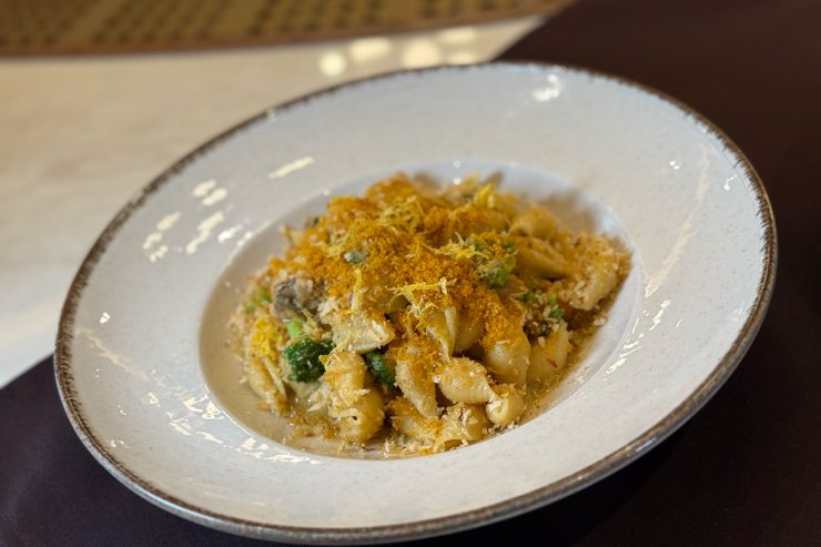 からすみが贅沢にかかったガーリック香る貝殻パスタ。白ワインとの相性も抜群!