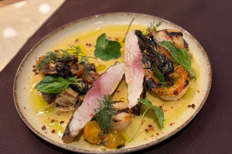 カンパチ、カウアイシュリンプ、ホタテなどの魚介本来の旨味を感じる一皿。サフランのソースがポイント。