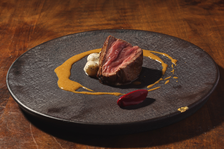 6皿めのメインディッシュ メインのキアヴェ炭焼きビーフテンダーロインは、トリュフクリームニョッキとビーツピューレ、肉汁ソースの絶妙なバランスが魅力。希望により黒トリュフを追加することもできます(+$35)。