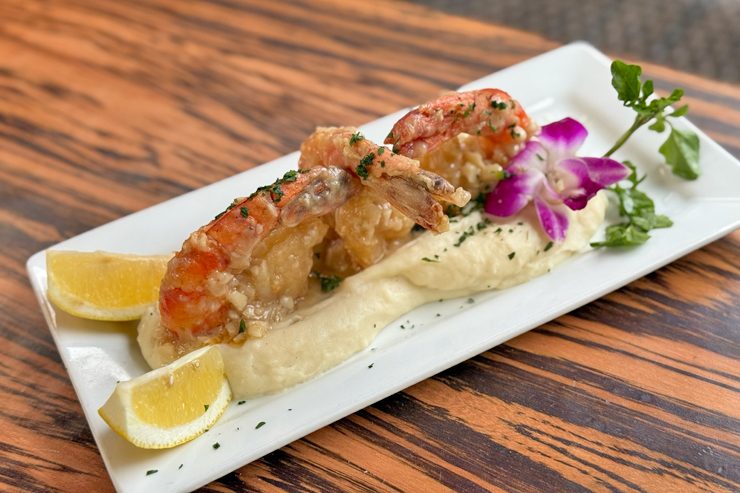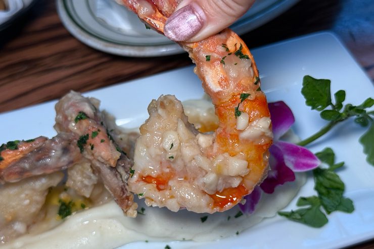 大ぶりのエビが3尾、マッシュポテトの上に豪快に盛り付けられた一皿。