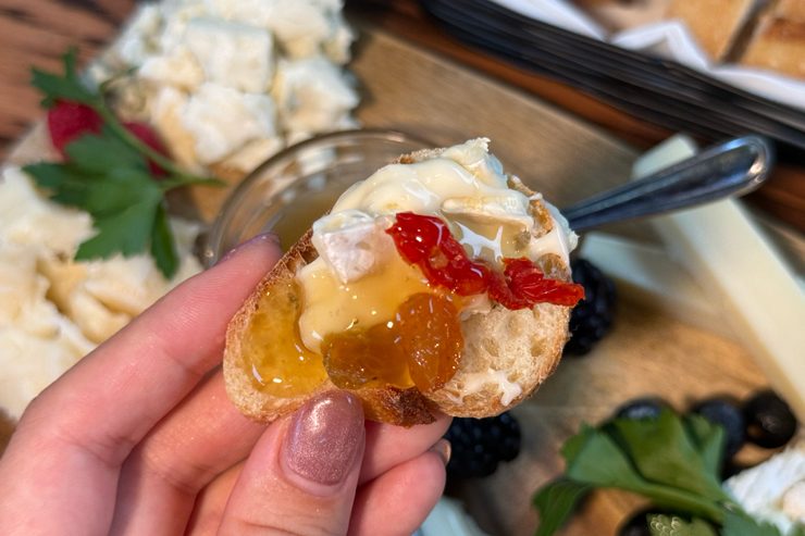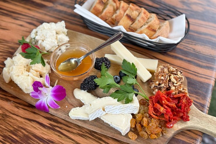 4種類のチーズに、ハチミツ、ナッツ、ドライトマト、レーズンやベリーなど、彩り豊かな食材が添えられた美しいプレート。