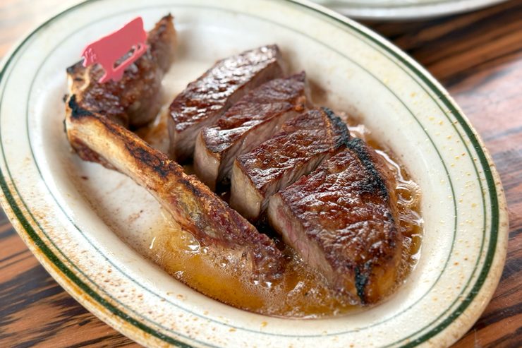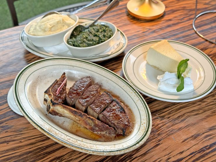 12オンス(約340g)の骨付き熟成ニューヨークサーロインステーキに、ほうれん草、マッシュポテト、チーズケーキがついたコスパ抜群のコース。