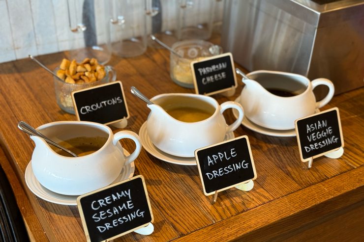ドレッシングもクリーミー・セサミ、アップル、アジアン・ベジーの特製3種に、クルトンやパルメザンチーズなどのトッピングも。