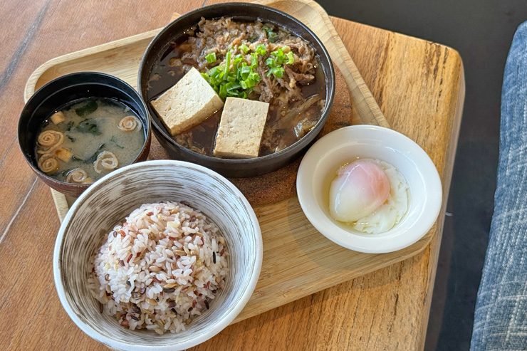 US和牛のすき焼きに、半熟卵とご飯が付いた定食スタイルで、ご飯は白米か10穀米から選べますよ。味はもう、日本で食べるすき焼きそのまま!ほっとする美味しさ。