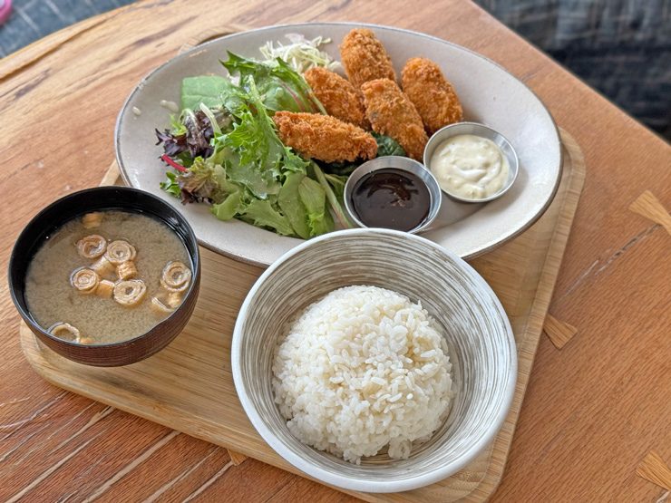 揚げたてサクサクの牡蠣フライがタルタルとカツソースに相性抜群!味噌汁とご飯が付いてくるのも嬉しい〜。