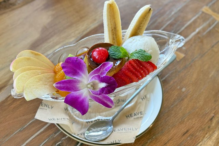 お気に入りの「カスタード・プディング・アラモード($16)」は、自家製プリンにバニラアイス、色とりどりのフルーツがのった贅沢な一皿。