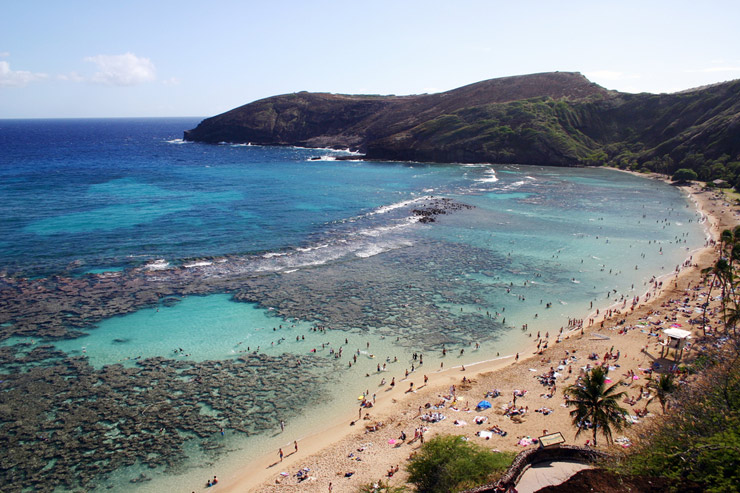 ハナウマ湾は、息を呑むほど透き通った美しい海として知られるオアフ島の人気観光スポット。湾内には豊かな珊瑚礁が広がり、色鮮やかな熱帯魚が泳いでいます。波が穏やかで浅瀬にも魚が多く、泳ぎが苦手な方でも楽しめるビーチです。救助員が駐在し、安心して遊べるので家族連れにも最適。