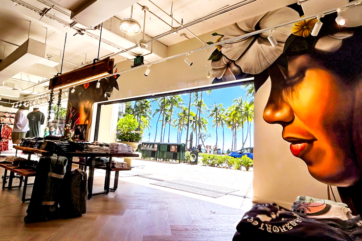 ハイアット リージェンシー ワイキキ内に壁画を描いている「POW WOW! Hawaii」で知られるローカルアーティスト、カメア・ハーダー氏は、この店のために「カメア」というブランドを立ち上げ、ユニセックスのアパレルラインを展開。ほかでは手に入れることができない、キングス&クイーンズ限定アイテムを購入することができます。また、店内入口横にはカメア氏によるアートが描かれ、そこから見えるデューク像は「まさにハワイ」な光景。アロハな気分でショッピングを楽しみましょう。
