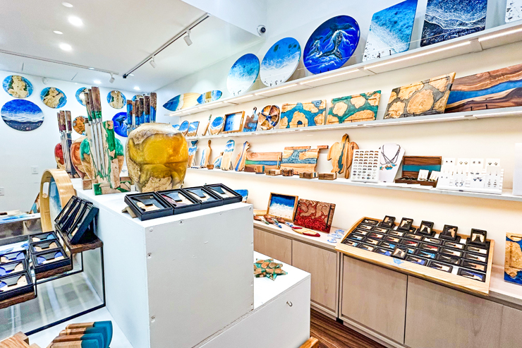 キングス&クイーンズのあるダイヤモンドヘッドタワーの逆側、エバタワー1階には、自分用にもハワイらしい特別なお土産探しにもぴったりな「アロハ アート コレクティブ」もオープン。レジンを使って海を表現する、ハワイに来たら絶対行きたいお店です。コアやマンゴー、モンキーポッドなどの木材にレジンを合わせ小さな海を作り上げたコレクションは、見ているだけで波の音が聞こえてきそう。カッティングボードや包丁、コースター、トレイなどからお好みの1品をチョイスして、日本でもハワイ気分に浸る時間を楽しんでみては?