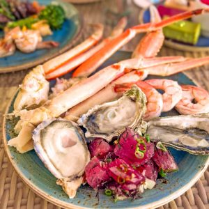常夏のハワイでクリスマスを迎えるなら、ワイキキの海風を感じるオープンエアレストランへ。ハイアット リージェンシー ワイキキ3階の「ザ ビュッフェ アット ハイアット」では、12月24日、25日の2日間限定でクリスマスディナービュッフェを開催します。カニや生牡蠣、ポケなどのシーフードに、目の前で切り分けるプライムリブ、ハワイ郷土料理に加え、ハチミツハムやラム肉、ハワイ風クリスマス野菜料理、エッグノッグチーズケーキ、ホットチョコレートステーションまで、50種類以上のメニューが勢ぞろい。握り寿司やカルビ、ハワイ産カンパチのロースト、チョコレートファウンテンなど定番人気メニューも味わえます。