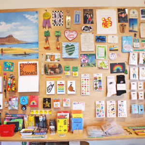 店内には、ポストカードやノート、クリエイティブな文房具、ユニークなステッカーやペンも人気で、お店のオーナーであり15年以上のグラフィックデザイナーとしてのキャリアを持つアダムさんのオリジナルグッズは、商品の約25%を占めます。ヴィンテージ風の引き出しユニットには、80〜90年代のアメリカン・ノスタルジーグッズが収納され、チャームを選んで、その場でキーホルダーやバッグチャームに仕立ててくれるサービスも大好評。懐かしさと温かみのあふれるお店で、ここでしか体験できないショッピングをお楽しみください。