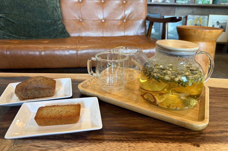地元のベーカリーから届く種類豊富な焼き菓子は、ショーケースの中からセレクトして。とくにビーガンハウピア&ポイ・バナナブレッドは、しっとりしていてお上品な甘さがちょうどいい!お茶やコーヒーにぴったりです。