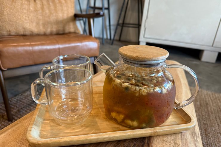 ガラスのポットにたっぷりのお茶は、見た目もかわいくて癒やされます。様々なお花や葉などを厳選、独自の方法で組み合わせて作られたオリジナルのポットティーは、香りも味わいも豊か。ナチュラル&ヘルシーな成分がふんだんに使われているので、身体にも心にもやさしいのです。