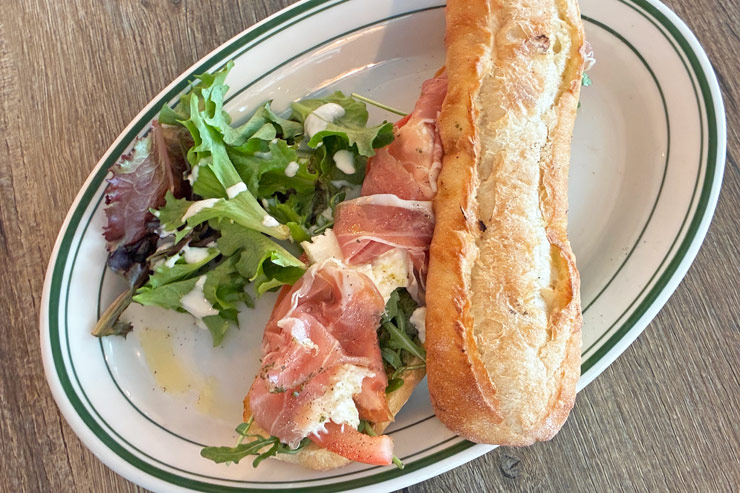 カプレーゼサンドイッチは、毎日お店で薄切りにするプロシュート、シェフが厳選したブッラータチーズ、トマト、アルグラ、バジルペーストを挟んだ一品です。