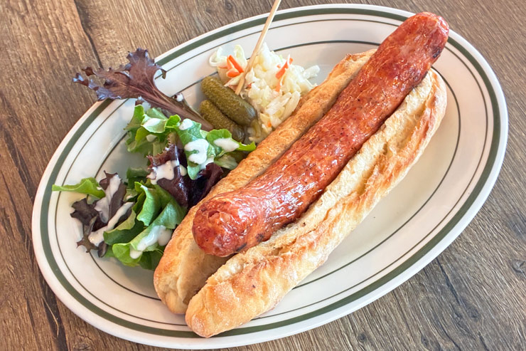 パリッと焼いた9インチのローカル産特大ソーセージを豪快に挟んだサンドイッチは、食べ応え抜群!ソーセージはしっかりめの味&旨味たっぷりで、朝からガッツリ食べたい時に最適です。