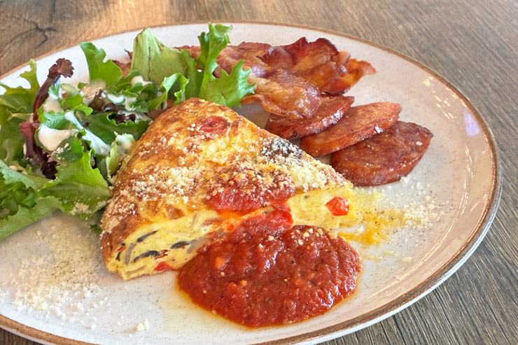 ベルペッパー、マッシュルーム、チーズなど様々な具材を入れ、厚めに焼き上げたスパニッシュオムレツは、卵や具材の味わいを引き立てる自家製のマリナーラソースがポイント。サラダ、ベーコン、ソーセージと共に提供されます。