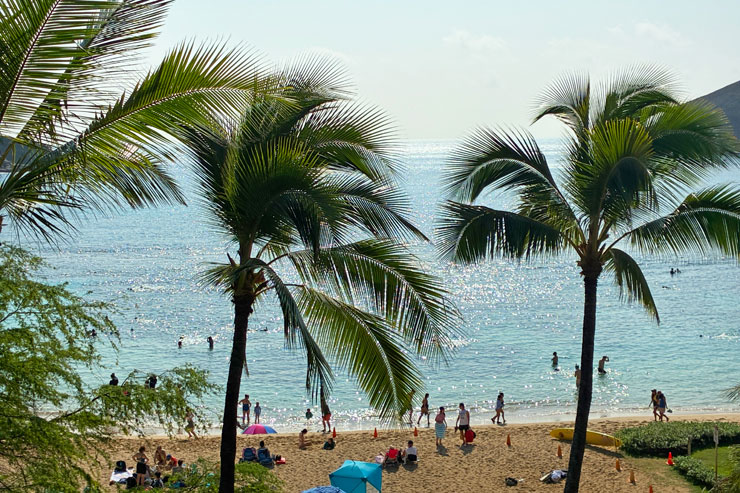 陽の光にキラキラと輝く海面、ヤシの木越しのビーチ…スロープを下っていくごとに少しずつ違うハナウマ湾の景色に足を止めてしまい、なかなか進まない(笑)。