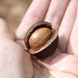 「外の分厚めの茶色い殻を手で割ったら中のナッツを台に置いて、石を使って割ってくださいね」というリュウキさんの説明通りにやってみると、割れた殻の中から白っぽいマカダミアナッツが現れました! 食べてみると、ほんのり甘みがある感じ。いつもはすでに加工されたマカダミアナッツばかり見ていたので「こんな殻が付いているんだ!生の味わいはこんな感じなんだ!」といろいろ知ることができました。