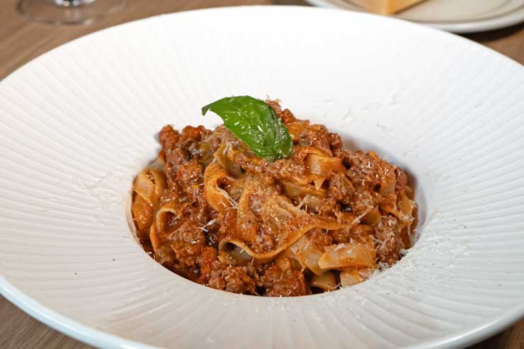 新鮮なタリアテッレに合わせるのは、時間をかけてていねいに煮込んだ自家製ビーフボロネーゼソース。イタリア伝統の調理法を踏襲し、肉の旨味と深いコクをしっかりと引き出しています。もちっとした平打ち麺と濃厚ソースが絡み合う、満足度の高い一皿です。