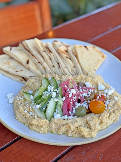 “漁師の小屋”をイメージしたカジュアルな雰囲気で、ランチにも夕方の一杯にもぴったりです。フムス&ナン $21