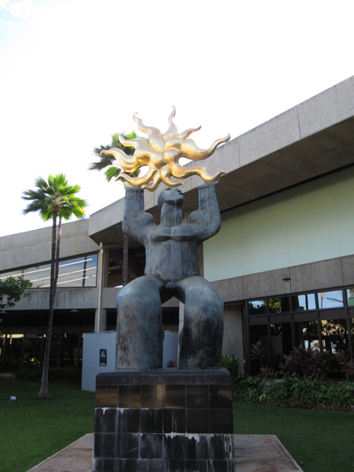 マウイ島カフルイ空港にある半神マウイの銅像またハワイという名については、有名なハワイキ伝説も関わってきます。これはハワイではなくむしろほかのポリネシアの島々に色濃い信条で、どこか遠くにハワイキという始祖の地がある…というもの。ハワイキが、死者の魂が帰っていく場所と考えられる場合もあります。ハワイキの名は島によって微妙に変わり、たとえばニュージーランドやマルケサスではハヴァイキ、タヒチではハヴァイイ。クック諸島ではアヴァイキ、サモアではサヴァイイとなります。