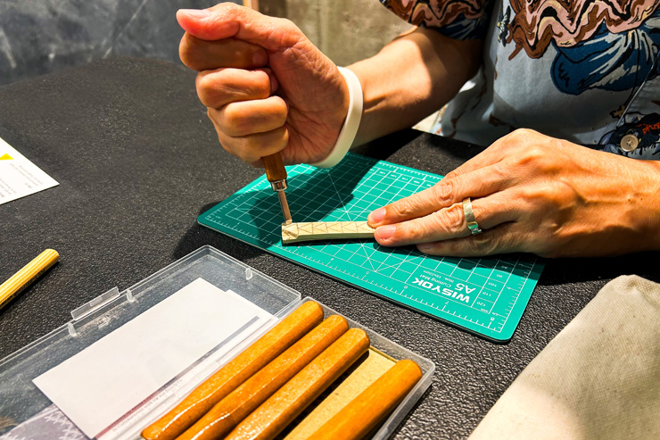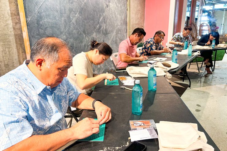 ケオラ氏自らがカウアイ島で採取してきた竹を使用し、伝統的な手法で彫り上げたスタンプは全部で10本。サメの歯をモチーフにした「ニホ」や、水の流れを表現する「コエアウ」など、自然から着想を得たハワイらしいデザインが完成しました。