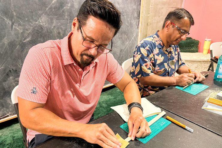ホテルスタッフ自らが手作りしたオリジナルのバンブースタンプ「オヘ カパラ(竹のスタンプ)」を使ったポストカードづくり体験がスタートします。ハワイアン カルチャー センターを率いるイヴァラニ・クアリイ・カホオハノハノさんの発案で始まった今回のプロジェクト。総支配人をはじめ、ホテルスタッフがボランティアで参加し、ハワイ文化特別講師であるアーティスト、ケオラ・カヤビヤブ氏の指導のもと、竹を彫り込んでスタンプを制作しました。