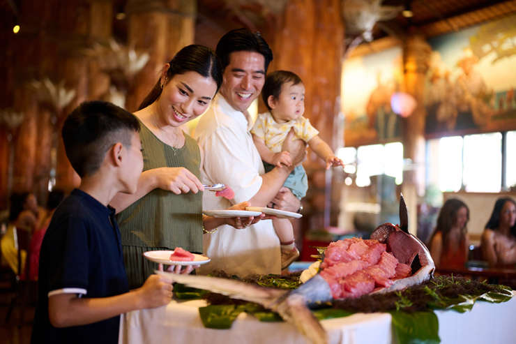 受賞歴を誇る本格的なルアウショー&ディナー。7~8時間かけて地中のかまどで蒸し焼きにしたイム(豚の丸焼き)をはじめ、ハワイの伝統料理やポリネシア各地の料理をビュッフェスタイルで堪能できます。華やかなフラや音楽とともに、スペシャルなひと時を演出します。