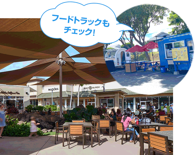 緑豊かな中庭や南国の風を感じる開放的なフードコートやカジュアルなフードトラックで地元のグルメが体験できるのもワイケレ・プレミアム・アウトレットの魅力です。買い物の合間にぜひご利用ください。