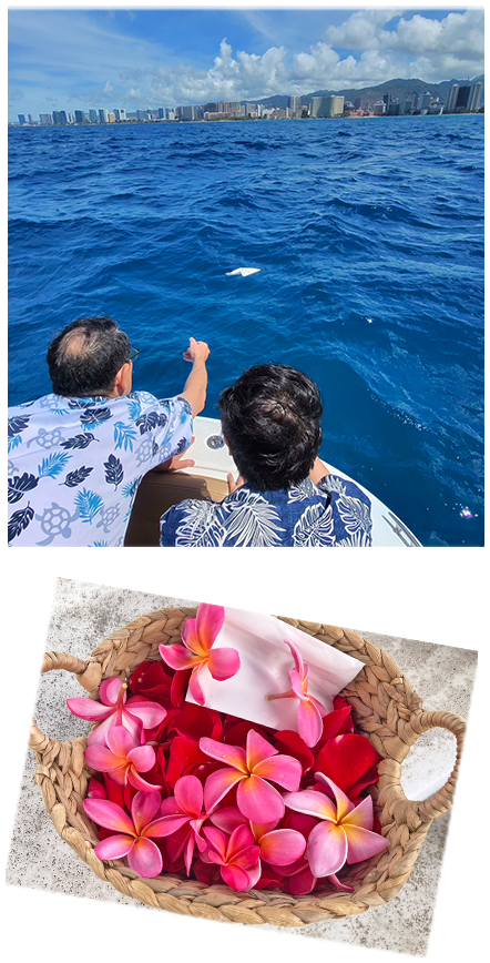 「遺骨をただ海に還すだけの散骨ではなく、遺族の方々にとってその日が新しい記念日になってほしい」。そんな願いから海洋散骨を「海洋記念葬」と名付け、残された遺族の方が心から笑顔になれるよう、ハワイでの散骨をサポート。ダイヤモンドヘッドを眺めながら散骨と献花をし、クルーズを楽しんで大切な時間を笑顔で締めくくります。