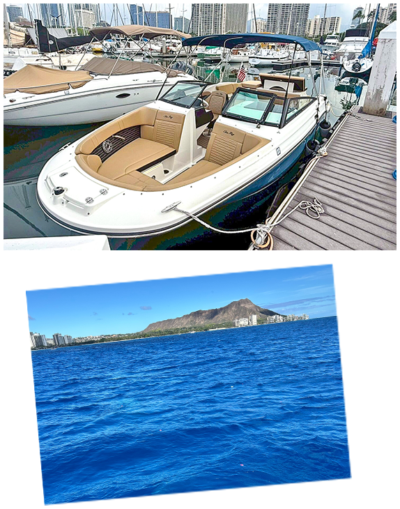 海洋散骨やカイラニクルーズで使用する6人乗りの貸切クルーザー「マハロ号」は、日本人キャプテンが安全第一で運航。コミュニケーションの際に言葉の心配も不要です。配慮の行き届いたサービスで快適にクルーズが楽しめます。