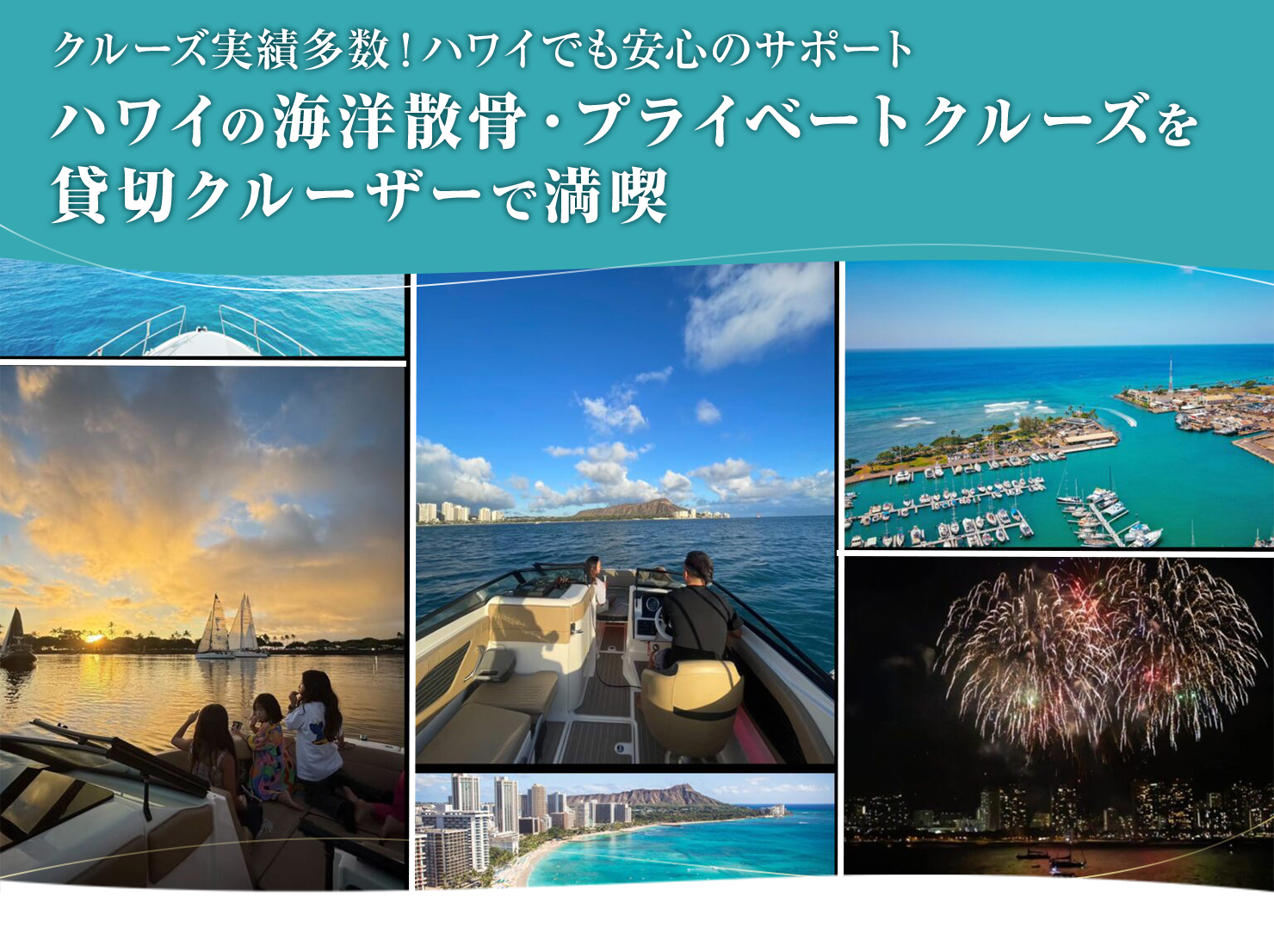 海とダイヤモンドヘッドを望むハワイらしいプライベートクルーズ。6人乗りの貸切クルーザーは、ファミリーや友だち同士でのクルーズにぴったり。記念日やパーティーなど、いろいろな目的に合った利用ができます。
